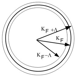 What happens to the ground state if we add interactions? It will be an admixture of filled Fermi sea and "particle-hole" states. The particles and the holes will be near the Fermi surface if the interactions are weak. So the ground state and its low energy excitations are determined by a band of single-particle states with \( |k|<\Lambda \) where \( k = K-K_F \ ,\) as depicted in Figure 2. The effective theory is obtained by integrating states outside the cut-off \( \Lambda \ .\) As we send \(\Lambda \to 0\) the flow will tell us if any given interaction is relevant, irrelevant or marginal Benfatto and Gallavotti (1990), Feldman and Trubowitz (1990), Shankar (1991), Polchinski (1992), Shankar (1994).