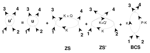 The ZS' and BCS diagrams give no contribution for a different reason. In ZS' there is a large momentum transfer \(Q'=K_4-K_1 = K_2-K_1\) which is of order \(K_F\ .\) The two momenta \(K,K+Q'\) must both lie on the shells being eliminated and also be related by a difference \(Q'\ .\) The reader may easily verify with a sketch that this restricts the range of the angle of the loop momentum to order \( d \Lambda\ .\) Since the \(dk\) integral is also of order \( d \Lambda\ ,\) the flow is quadratic in \( d \Lambda\) and the logarithmic derivative with respect to the cut-off vanishes. Likewise the angle of the internal Cooper pair in the BCS diagram is limited to a width \( d \Lambda\ ,\) in addition to \(dk\ ,\) again leading to a flow of order \((d \Lambda )^2\ .\)