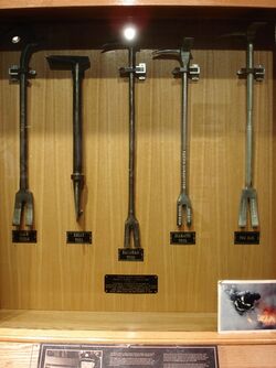 A Halligan tool on display at the NYC Fire Museum (middle), next to the earlier Kelly tool (2nd from left) on which it was based