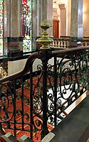 Pineapple finial atop corner post of an ornate metal stair railing, Town Hall, Birkenhead, England