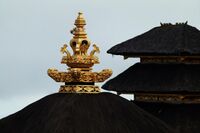The kalash is a finial on Hindu temples.[9] On Karnata Dravida temples, the kalash is placed on top of a dome with an inverted lotus flower shape in between.[10] There may also be lotus petals at the top, before the kalash narrows to a single point, or bindu.[10]