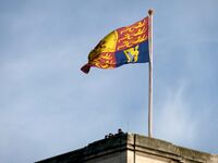 The flagpole on Buckingham Palace, London, here flying the Royal Standard, has a crown-shaped finial.