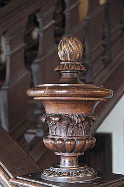 Public garden (park) railings often end in finials, and wooden posts tend to have turned wood finials. Turned wood finials are used on various pieces of furniture.[16] While the purpose of finials on bed posts is mostly decorative,[17] they serve a purpose on curtain rods, providing a way to keep a curtain from slipping off the end of a straight rod.