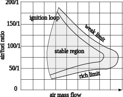 The combustion efficiency of most aircraft gas turbine engines at sea level takeoff conditions is almost 100%. It decreases nonlinearly to 98% at altitude cruise conditions. Air-fuel ratio ranges from 50:1 to 130:1. For any type of combustion chamber there is a rich and weak limit to the air-fuel ratio, beyond which the flame is extinguished. The range of air-fuel ratio between the rich and weak limits is reduced with an increase of air velocity. If the increasing air mass flow reduces the fuel ratio below certain value, flame extinction occurs.[51]