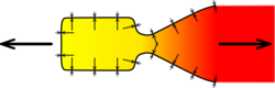 A propelling nozzle produces a high velocity exhaust jet. Propelling nozzles turn internal and pressure energy into high velocity kinetic energy.[29] The total pressure and temperature don't change through the nozzle but their static values drop as the gas speeds up.