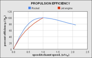 | Rocket | Carries all propellants and oxidants on board, emits jet for propulsion[28] | Very few moving parts. Mach 0 to Mach 25+; efficient at very high speed (> Mach 5.0 or so). Thrust/weight ratio over 100. No complex air inlet. High compression ratio. Very high-speed (hypersonic) exhaust. Good cost/thrust ratio. Fairly easy to test. Works in a vacuum; indeed, works best outside the atmosphere, which is kinder on vehicle structure at high speed. Fairly small surface area to keep cool, and no turbine in hot exhaust stream. Very high-temperature combustion and high expansion-ratio nozzle gives very high efficiency, at very high speeds. | Needs lots of propellant. Very low specific impulse – typically 100–450 seconds. Extreme thermal stresses of combustion chamber can make reuse harder. Typically requires carrying oxidizer on-board which increases risks. Extraordinarily noisy. |