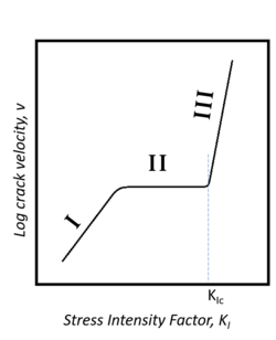 Illustrated are regions of different crack propagation under stress corrosion cracking. In region I, crack propagation is dominated by chemical attack of strained bonds in the crack. In region II, propagation is controlled by diffusion of chemical into the crack. In region III, the stress intensity reaches its critical value and propagates independent of its environment.