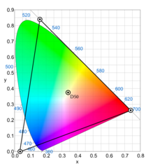 In computer and television screen color displays, the corners of the gamut triangle are defined by commercially available phosphors chosen to be as near as possible to pure red, green, and blue, within the area of real colors. Because of this, these displays inevitably exhibit colors nearest to real colors lying within its gamut triangle, rather than exact matches to real colors that plot outside of it. The specific gamuts available to commercial display devices vary by manufacturer and model and are often defined as part of international standards—for example, the gamut of chromaticities defined by sRGB color space was developed into a standard (IEC 61966-2-1:1999 [3]) by the International Electrotechnical Commission.