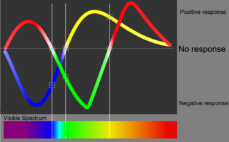 A chimerical color is an imaginary color that can be seen temporarily by looking steadily at a strong color until some of the cone cells become fatigued, temporarily changing their color sensitivities, and then looking at a markedly different color. The direct trichromatic description of vision cannot explain these colors, which can involve saturation signals outside the physical gamut imposed by the trichromatic model. Opponent process color theories, which treat intensity and chroma as separate visual signals, provide a biophysical explanation of these chimerical colors.[4] For example, staring at a saturated primary-color field and then looking at a white object results in an opposing shift in hue, causing an afterimage of the complementary color. Exploration of the color space outside the range of "real colors" by this means is major corroborating evidence for the opponent-process theory of color vision. Chimerical colors can be seen while seeing with one eye or with both eyes, and are not observed to reproduce simultaneously qualities of opposing colors (e.g. "yellowish blue").[4] Chimerical colors include: