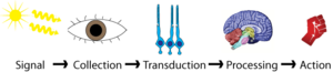 Signal detection theory quantifies the experience of the subject to the presentation of a stimulus in the presence of noise. There is internal noise and there is external noise when it comes to signal detection. The internal noise originates from static in the nervous system. For example, an individual with closed eyes in a dark room still sees something—a blotchy pattern of grey with intermittent brighter flashes—this is internal noise. External noise is the result of noise in the environment that can interfere with the detection of the stimulus of interest. Noise is only a problem if the magnitude of the noise is large enough to interfere with signal collection. The nervous system calculates a criterion, or an internal threshold, for the detection of a signal in the presence of noise. If a signal is judged to be above the criterion, thus the signal is differentiated from the noise, the signal is sensed and perceived. Errors in signal detection can potentially lead to false positives and false negatives. The sensory criterion might be shifted based on the importance of the detecting the signal. Shifting of the criterion may influence the likelihood of false positives and false negatives.[6]