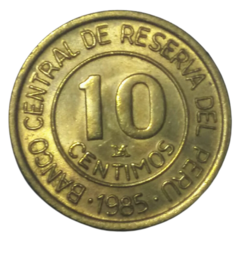 Coins were introduced in 1985 in denominations of 1, 5, 10, 20, and 50 centimos (designs were taken from the previous 10, 50, 100, and 500 soles de oro coins), plus 1 and 5 intis. The 1 céntimo coin was issued only in 1985. The 5 céntimo coins were issued until 1986. All the other denominations were issued until 1988. All coins featured Navy Admiral Miguel Grau: cent coins on the reverse, Inti coins on the obverse.