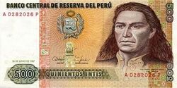In June 1985, notes were introduced in denominations of I/.10, I/.50 (taken from previous 10,000 and 50,000 soles de oro notes) and I/.100, followed by I/.500 in December of the same year. The next year, I/.1,000 notes were added, followed by I/.5,000 in 1988. I/.10,000, I/.50,000 and I/.100,000 notes were added in 1989. I/.500,000 denominations were added early in 1990[3], I/.1,000,000 denominations were added in mid-1990, and I/.5,000,000 in August 1990. The last ever Inti note was a second variation of the I./5.000.000 note with overprint over the place of watermark and was printed and issued in 1991, which by the time of printing and issuing was officially I./.m. 5.00. The obverses featured: