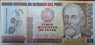 ![]() 5.000.000 Intis note(1991), highest denonimation note of the Inti | |