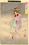 In the play Love Story at the Snow-covered Barrier, the villain's wishes to cut down a giant blossoming black cherry tree are thwarted. As he wields an ax, a courtesan who is the living incarnation of the spirit of the tree manages to freeze the villain's hands. Then the spirit herself appears and overcomes him.