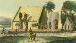 Settlements by the Polynesians were of two categories: the hamlet and the village. The size of the island inhabited determined whether or not a hamlet would be built. The larger volcanic islands usually had hamlets because of the many zones that could be divided across the island. Food and resources were more plentiful. These settlements of four to five houses (usually with gardens) were established so that there would be no overlap between the zones. Villages, on the other hand, were built on the coasts of smaller islands and consisted of thirty or more houses—in the case of atolls, on only one of the group so that food cultivation was on the others. Usually, these villages were fortified with walls and palisades made of stone and wood.[84]