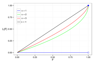 The Gini coefficient is a measure of the deviation of the Lorenz curve from the equidistribution line which is a line connecting [0, 0] and [1, 1], which is shown in black (α = ∞) in the Lorenz plot on the right. Specifically, the Gini coefficient is twice the area between the Lorenz curve and the equidistribution line. The Gini coefficient for the Pareto distribution is then calculated (for [math]\displaystyle{ \alpha\ge 1 }[/math]) to be