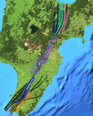 New Zealand lies along the boundary between the Australian and Pacific Plates. In the South Island most of the relative displacement between these plates is taken up along a single dextral (right lateral) strike-slip fault with a major reverse component, the Alpine Fault. In the North Island the displacement is mainly taken up along the Kermadec subduction zone, although the remaining dextral strike-slip component of the relative plate motion is accommodated by the North Island Fault System (NIFS).[5] A group of dextral strike-slip structures, known as the Marlborough Fault System, transfer displacement between the mainly transform and convergent type plate boundaries in a complex zone at the northern end of the South Island.[6] The earthquake occurred on the Wairarapa Fault which is part of the NIFS.