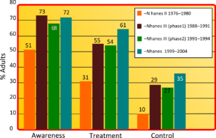 Graph showing, prevalence of awareness, treatment and control of hypertension compared between the four studies of NHANES[146]