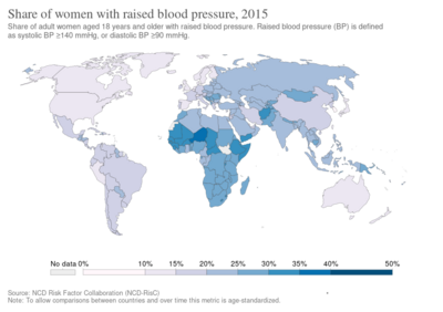 As of 2014[update], approximately one billion adults or ~22% of the population of the world have hypertension.[141] It is slightly more frequent in men,[141] in those of low socioeconomic status,[6] and it becomes more common with age.[6] It is common in high, medium, and low income countries.[141][142] In 2004 rates of high blood pressure were highest in Africa, (30% for both sexes) and lowest in the Americas (18% for both sexes). Rates also vary markedly within regions with rates as low as 3.4% (men) and 6.8% (women) in rural India and as high as 68.9% (men) and 72.5% (women) in Poland.[143] Rates in Africa were about 45% in 2016.[144]