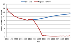From Handwiki The societal effects of negligible senescence considers a scenario where negligible senescence is achieved on a societal wide level in humans. There is much controversy about the realistic timeline of such a scenario. The predictions vary in time starting from 2037[1] till later than the 21st century.[2] The effects of negligible senescence has a profound impact on economy, climate, demographics and impacts social structures. The baseline scenario ceteris paribus of negligible senescence is more population growth while a larger healthier labor force would spur economic growth.[3]