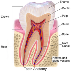 Enamel is the hardest substance in the human body and contains the highest percentage of minerals (at 96%),[2] with water and organic material composing the rest.[3] The primary mineral is hydroxyapatite, which is a crystalline calcium phosphate.[4] Enamel is formed on the tooth while the tooth develops within the jaw bone before it erupts into the mouth. Once fully formed, enamel does not contain blood vessels or nerves, and is not made of cells. Remineralisation of teeth can repair damage to the tooth to a certain degree but damage beyond that cannot be repaired by the body. The maintenance and repair of human tooth enamel is one of the primary concerns of dentistry.