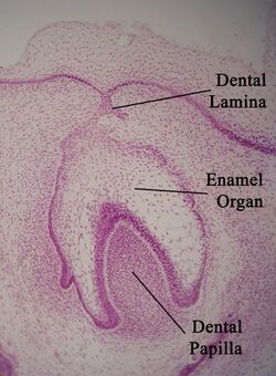 Enamel formation is part of the overall process of tooth development. Under a microscope, different cellular aggregations are identifiable within the tissues of a developing tooth, including structures known as the enamel organ, dental lamina, and dental papilla.[13] The generally recognized stages of tooth development are the bud stage, cap stage, bell stage, and crown, or calcification, stage. Enamel formation is first seen in the crown stage.}