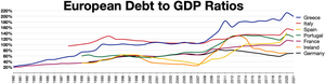 Between 2009 and 2017, the Greek government debt rose from €300bn to €318bn.[20][21] However, during the same period the Greek debt-to-GDP ratio rose up from 127% to 179%[20] due to the severe GDP drop during the handling of the crisis.[22][23]