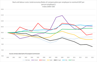 Real unit labour costs: total economy (ratio of compensation per employee to nominal GDP per person employed)