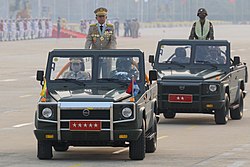 Burma's Min Aung Hlaing rides in a car during a military parade, 2021. Really nails the tinpot parade look.