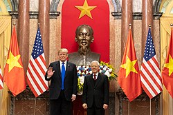 Vietnamese leader Nguyễn Phú Trọng meets Donald Trump, 2019. But look! Hồ Chí Minh wants to be in the picture too!