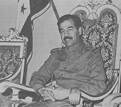 Saddam Hussein on a throne, 1988. Bonus points for his dictator moustache.