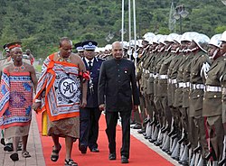 King Mswati III (in orange) of eSwatini inspects troops, 2018. Gets points for a unique take on dictator dress.