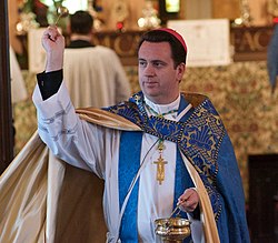 In Lutheranism, asperges occurs as a part of the Divine Service on Easter Sunday as a remembrance of baptism.[5] The formula used is nearly identical to that of the Roman Catholic Church.[6][7]