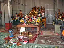 In the religious context, standing bells are primarily associated with Buddhist meditation and chanting, although they are also used in Taoist practices.[30] In Chinese Buddhist temples the chanting of prayers may be punctuated by the striking of a qing, typically a hammered bronze bowl between 10 and 15 cm (3.9 and 5.9 in) in diameter. The qing is usually paired with a muyu (wood block).[8] In Japanese temples, the rin is used along with a rei (a small hand bell), and two percussion instruments: an orugoru (a set of small gongs) and a kei (a stone or metal plate). The rin is also used in household worship.[7][31] Buddhist ritual makes no use of the 'singing' mode of bell operation.[32]