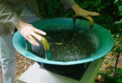 It is sometimes stated that singing bowls are 'traditionally' made of an alloy consisting of various metals, often seven, each associated with a heavenly body. Those commonly mentioned are gold, silver, mercury, copper, iron, tin and lead (or antimony).[45][17] This is said to be supported by the results of a 1996 analysis of two bowls by Concordia University, which found them to be essentially of bell metal with small quantities—consistent with impurities—of some of the other metals that were looked for, namely lead, zinc, iron and silver. No gold or mercury was found within the accuracy of the measuring apparatus.[46]