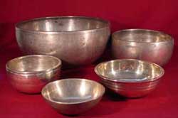 The usual manufacturing technique for standing bells was to cast the molten metal followed by hand-hammering into the required shape.[32] Modern bells/bowls may be made in that way, but may also be shaped by machine-lathing.