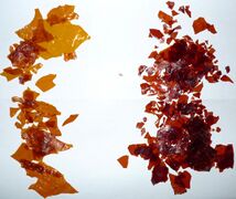 Closeup of Waxy #1 Orange (L) and Dewaxed Bona (R) shellac flakes. The former—orange shellac—is the traditional shellac used for centuries to finish wooden wall paneling and kitchen cabinets.