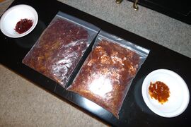 The raw shellac, which contains bark shavings and lac bugs removed during scraping, is placed in canvas tubes (much like long socks) and heated over a fire. This causes the shellac to liquefy, and it seeps out of the canvas, leaving the bark and bugs behind. The thick, sticky shellac is then dried into a flat sheet and broken into flakes, or dried into "buttons" (pucks/cakes), then bagged and sold. The end-user then crushes it into a fine powder and mixes it with ethyl alcohol before use, to dissolve the flakes and make liquid shellac.[11]