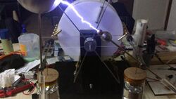 In 1887, Weinhold modified the Leyser machine with a system of vertical metal bar inductors with wooden cylinders close to the disk for avoiding polarity reversals. M. L. Lebiez described the Lebiez machine, that was essentially a simplified Voss machine (L'Électricien, April 1895, pp. 225–227). In 1893, Louis Bonetti patented a machine with the structure of the Wimshurst machine, but without metal sectors in the disks.[10][11] This machine is significantly more powerful than the sectored version, but it must usually be started with an externally applied charge.