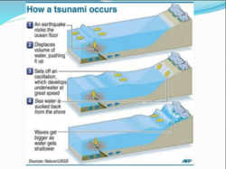 Tsunamis also provide another case whereby the seismic energy released from an earthquake rupture causes damage on and offshore. Literally meaning "harbor wave," tsunami's are shown to create large waves that travel more than 500 miles per hour. First and foremost, tsunami's require substantial seismic energy to displace its high volume of water. Although other factors can create tsunami's, high earthquake magnitudes are key in displacing water, especially when the earthquake happens near a subduction zone. In this case, the earthquake rupture occurs, causing the ocean floor to rise or drop. The water will then seek to level itself out, but will do so by propagating in a certain direction (see Figure 3 for a visual representation). The potential for these fast traveling waves are particularly damaging to coastal cities, or harbor towns. Buildings, cars, and other debris can be swept up and put elsewhere. The 2011 Tōhoku earthquake generated a devastating tsunami whose damage was estimated in the millions.