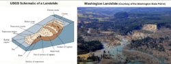 Lastly, landslides are another geologic feature that can occur from an earthquake rupture. One way or another, landslides involve the movement of rocks, sediment, and other materials; this movement can either be cohesive or fragmented.[3] If an earthquake rupture were to occur, for instance in a hilly residential area, the seismic energy would have potential to disturb the underlying sediment, especially if the sediment were saturated and weak. If the magnitude were big enough, the sediment of the slope would fail, causing any complexes to fail as well (refer to Figure 4). Much like how a tsunami can pick up debris on and off the ocean, landslides can also carry debris and put it elsewhere. Like the many ways an earthquake rupture can occur, there are many kinds of landslides.