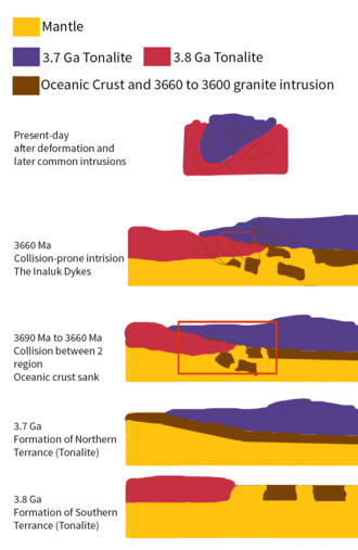 Collision of the old and new block happened between 3690 Ma and 3660 Ma,[2] since 3690 Ma was the age yielded from the youngest tonalite,[11] which is only found in the Northern terrane. This can be interpreted as indicative of a much further distance between the northern region and the southern region at 3690 Ma than we see today. 3660 Ma is the age measured from the ultramafic-to-dioritic Inaluk dykes,[11] which is a common intrusion in both terrane. This potentially brackets the time of collision between these two intrusive events.