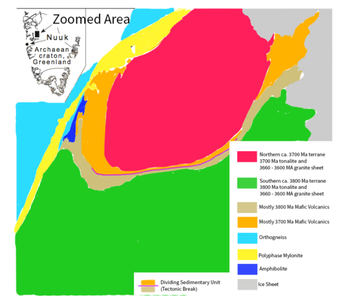 A thin metasedimentary unit derived mainly from banded iron formations, chert and carbonate rocks is believed to be the dividing unit between the 3.8 Ga region and 3.7 Ga region. In some well-exposed area, highly tectonized and recrystallised mylonites are present.[2]