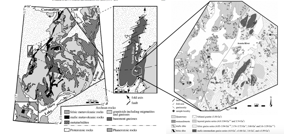 | Acasta Gneisses | 4.03 Ga to 3.96 Ga | Slave Craton in Northwest Canada | Highly deformed TTG, with interleaving amphibolite, ultramafic rocks and pink granites | |
