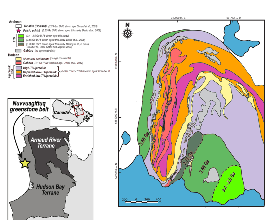 The Nuvvuagituq Belt is bounded by Eoarchean tonalites, trondhjemites and granodiorite aged around 3660 Ma, and further surrounded by younger approximately 2750 Ma tonalities.[33] Surrounding tonalites, trondhjemites and granodiorites (TTGs) are the product of partial melting of Hadean Mafic lithologies, which was similar to the informally-named Ujaraaluk unit. The remelt products of Hadean Ujaraaluk and the exposed, eoarhcean cummingtonite amphibolite unit share a similar geochemical composition, i.e. isotopic ratio of 142-Neodymiun and 144-Neodymium, which suggests that these isotopic ratios can be inherited from one generation of melt to another.[27] The TTG-Felsic crusts formed in multiple episodes. By U-Pb zircon geochronology, the fourfold episodic TTGs were dated to be 3.76 Ga, 3.66 Ga, 3.5–3.4 Ga and 3.35 Ga in age.[33]