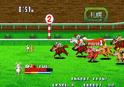 Stakes Winner is a thoroughbred horse racing game similar to Winning Post, where players take control of any of the available horses, each with their own strengths and weaknesses, to compete against either AI opponents or other human players across multiple races.[1][2][3][4][5][6] Players control their horse with the joystick while two action buttons are used; one controlling the reins for small accelerations that drains little portions of the horse's stamina and another for the whip for fast speed, which drastically consumes stamina from the horse and if the stamina is depleted completely, racing is given up for a short period.[7] Two quick taps on the joystick at any direction allows the horse to push back an opponent in front of them, however two quick taps on the opposite side reduces speed.[7] Power-ups also spawn on the race track for players to pick up.[7] Failing to qualify for the next race results in a game over screen unless players insert more credits into the arcade machine to continue playing.