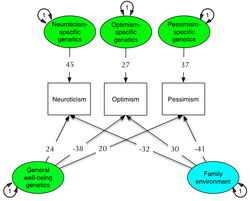 As with all psychological traits, differences in both dispositional optimism and pessimism[4] and in attributional style[25] are heritable. Both optimism and pessimism are strongly influenced by environmental factors, including the family environment.[4] Optimism may be indirectly inherited as a reflection of underlying heritable traits such as intelligence, temperament, and alcoholism.[25] Evidence from twin studies shows that the inherited component of the dispositional optimism is about 25 percent, making this trait a stable personality dimension[26][page needed] and a predictor of life outcomes.[27] Its genetic origin interacts with environmental influences and other risks, to determine the vulnerability to depression across the lifespan.[28] Many theories assume optimism can be learned,[6] and research supports a modest role of family-environment acting to raise (or lower) optimism and lower (or raise) neuroticism and pessimism.[4]