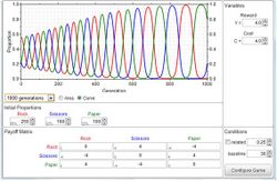 Rock paper scissors incorporated into an evolutionary game has been used for modelling natural processes in the study of ecology.[39] Using experimental economics methods, scientists have used RPS games to test human social evolutionary dynamical behaviours in laboratories. The social cyclic behaviours, predicted by evolutionary game theory, have been observed in various laboratory experiments.[40][41]