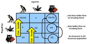 Similarly, using inequalities, it can be shown that an additional hawk or dove mutant entering this ESS state eventually results in less fitness for their kind – both a true Nash and an ESS equilibrium. This example shows that when the risks of contest injury or death (the cost C) is significantly greater than the potential reward (the benefit value V), the stable population will be mixed between aggressors and doves, and the proportion of doves will exceed that of the aggressors. This explains behaviours observed in nature.