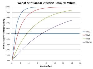 as shown in the adjacent graph. The intuitive sense that greater values of resource sought leads to greater waiting times is borne out. This is observed in nature, as in male dung flies contesting for mating sites, where the timing of disengagement in contests is as predicted by evolutionary theory mathematics.[16]